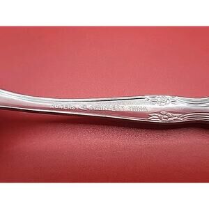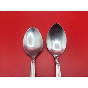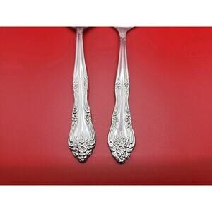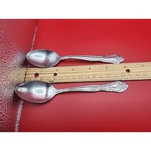 The product is a set of 2 vintage Stanley Roberts Dream Rose stainless steel teaspoons by Rogers Co. The teaspoons are silver in color and feature a floral design on the handle. Each teaspoon measures 6 inches in length and is made of stainless steel. The set is part of the adult flatware collection and has a nature and botanical theme, with a handle pattern that also includes floral elements. The flatware set is not handmade and was manufactured in China.