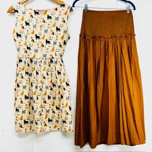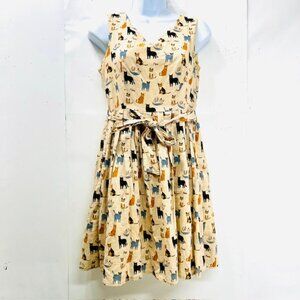 1) Vintage Wardrobe Meow, V neck, sleeveless, cotton, bow tie, pleaded, Meow/cats printed all over, lined