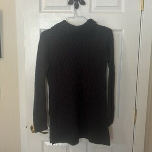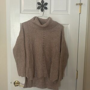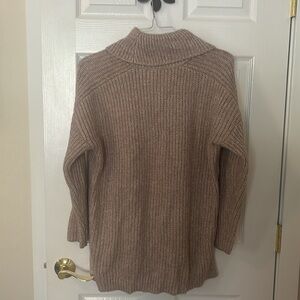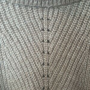This is a 2-sweater bundle. The first is the light brown Time and Tru sweater with loads of details, I.e. the diagonal weave in the front middle panel, the open weave in the front, the high low hemline, and the front and the bias weave at the shoulders in the back. It measures 24” PTP, the front is 23” long and the back is 27” long from the shoulder seam.