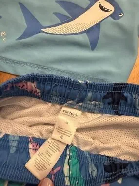 2 Swimsuits and Rashguards Pastel Sharks - Carter’s 2T Neutral Sailboats - Tommy Bahama 2T Pastel Sharks set - great used condition Neutral Sailboats - New with Tags