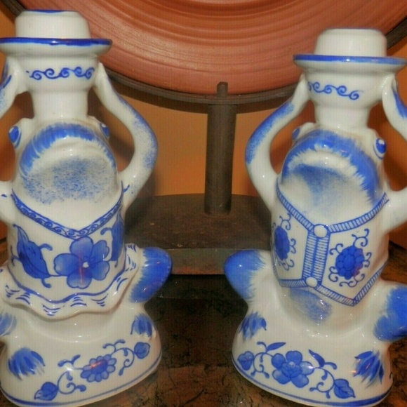 2 TALL BLUE & WHITE CANDLE STICK HOLDERS ~ 9 inch~