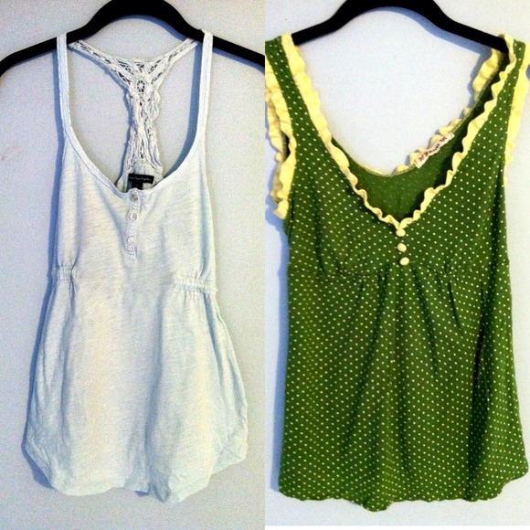 2 Babydoll Style Tank Tops! 1st: Light Blue American Eagle Tank with Crochet Back & String Tie-Back. 2nd: Forever21 Green Tank with Yellow Polkadots & Trim. Both Size Small