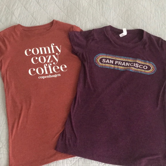 Gently used Fitted Tees. Only wore once. Burnt Orange colored Tee is from Aeropostale and the purple tee was bought in San Francisco. The purple tee is a medium but fits like a small. Both in good condition.