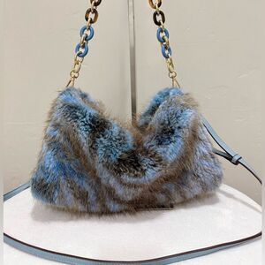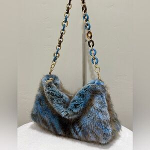 Uniquely beautiful real fur slouchy bag. Handmade from dyed genuine Beaver fur with sheepskin lining, soft side design. Special 2 tone color gradient. Spacious enough for your phone, wallet, cosmetics, sunglasses, compact umbrella, and other items. Includes 1 custom shoulder chain and 1 leather strap, multi way use, wear as a clutch, underarm, shoulder bag or crossbody. This gorgeous purse is lightweight and very soft, perfect for casual wear, or a gift for an important someone.