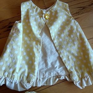 Gently worn. The yellow outfit is handmade. It has an open butterfly back with matching bloomers!