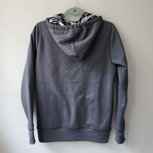 Gray hooded sweatshirt. Loose fit, women's size small. Logo on chest and cuff. Black, white, and gray camo detail with hot pink stitching.