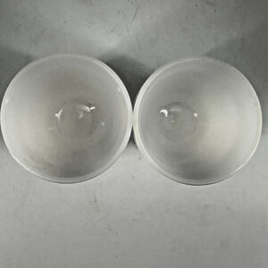 The product is a set of 2 vintage Indiana Glass milk glass footed dessert cups in the Harvest Grape pattern. These round, glossy white cups are perfect for all occasions and are made of glass, with a production style of milk glass. The mid-century modern style, along with the height of 4" and width of 3.5", makes them a unique and elegant addition to any table setting. Hand wash only to maintain their vintage charm. The brand Indiana Glass is known for its quality craftsmanship and this set is a beautiful representation of that reputation.