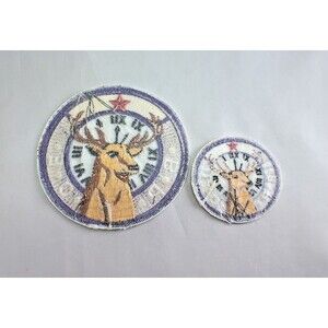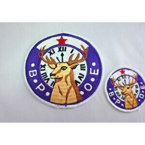 This product is a set of two vintage BPOE Benevolent Order of Elks Lodge embroidered jacket vest patches, measuring 5" and 3" respectively. These patches likely symbolize the organization's historical significance and serve as collectibles for members or enthusiasts of the Elks fraternal organization. The patches feature the emblem of the Elks organization, making them a unique and nostalgic addition to any collection or outfit.