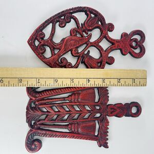 Set of 2 VTG Metal Footed Trivet Rests - Pennsylvania Dutch Design - Red over Black
