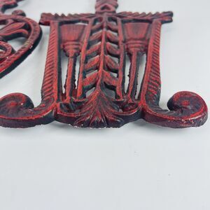 Add a touch of folk art charm to your kitchen with this set of two vintage metal footed trivet rests! Each trivet features delightful Pennsylvania Dutch-inspired designs including brooms, wheat, hearts, birds, and tulips. The classic red over black color scheme enhances their rustic appeal.