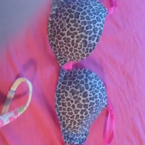 2 Victoria's secret bras, cheetah print on is a 36 A same as floral print, floral print has little rhinestones and a little heart in between cups with a Vs in it, barely worn floral one has never been worn
