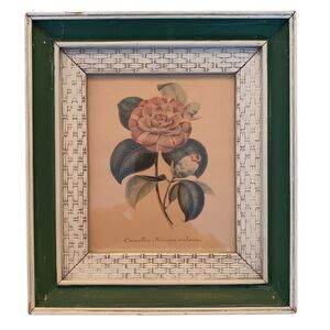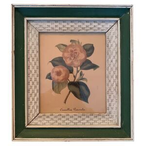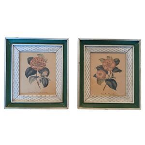 This set of 2 matching vintage lithographs features beautiful Camellia flowers, which is sure to add some antique charm to any home decor. With their multi-color pink, white, & green designs and shabby chic-farmhouse style frame, they're a perfect addition for collectors of post-1940 decorative items.