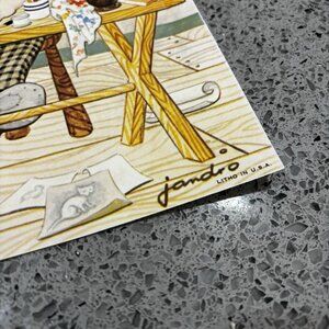 Add a touch of vintage charm to any room with these two original lithograph art prints by JANDRO. Featuring cheerful children, these medium-sized prints are perfect for a kid's room or any room in the house. The colorful paper material and vibrant multicolor palette make these prints stand out.