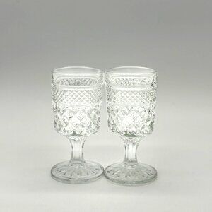The set includes two elegant vintage Anchor Hocking Wexford diamond cut goblets, perfect for serving wine or water. Add a touch of sophistication to your dining experience with these timeless glasses.