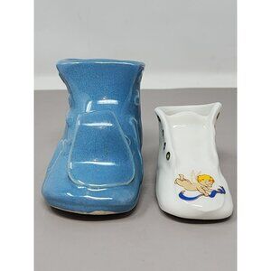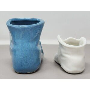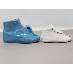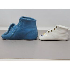 2 Vintage Art Pottery Ceramic Baby Shoes Blue White Barton Fine China Glazed