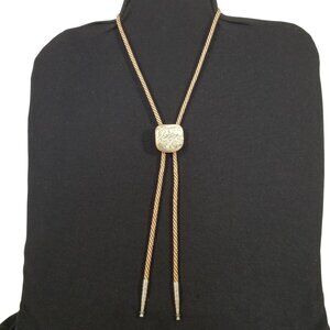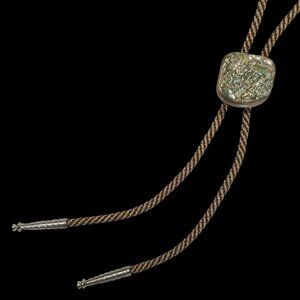 This swell pair of western, cowboy style, bolo ties are vintage, likely from the 50s-70s era. One has an iridescent, abalone shell slide on a (probably rayon) brown and gold braided cord, with interesting, silver metal tips (called aiguilettes). In like new condition.