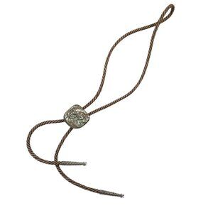 The other tie has a free form silver slide, with a black, braided leather cord, and ridged, silver metal tips. The cord looks new, but the slide has some very minor wear that likely can be polished away. A magnet doesn't stick to the silver slide or either set of metal tips, so not sure if silver or not.