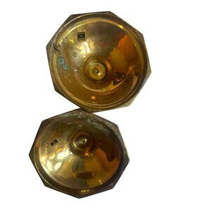 These vintage brass candlestick holders stand 5 1/4 inches tall and offer a classic, elegant design suitable for a range of decor styles. Made in India.