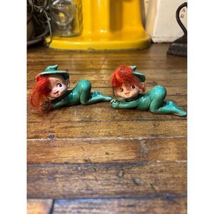 Cute little Brinn's Pixie Elves. No chips or cracks. There is a spot on hat that looks like where the hair was glued on both, and both look like they have some light green outline on ears and on different parts of the face. May be outline on faces.