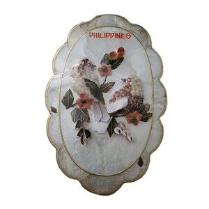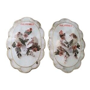 This product is a set of 2 vintage Capiz shell pieces in a scalloped design, featuring intricate seashell art of birds and flowers, with "Phillipines" across the top.