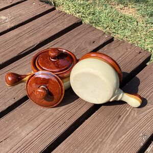2 Vintage Ceramic Ramekins with Lids Brown Beige Handles Soup Crocks