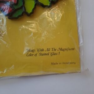 2 Vintage Crystalline acrylic faux stained glass hanging Christmas wreaths. See-through window decoration. Used still in original packaging. Some broken off black trim on bow tails, shown in last two pictures. Made in Hong Kong.