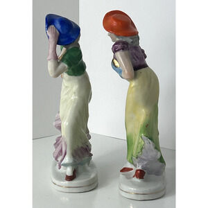 Two vintage dancing ladies figurines from Occupied Japan in the 1940s are rare and unique collectibles. Standing at 6 inches tall, these ceramic statues depict graceful women engaged in a dance, hand-painted in multicolor with a glazed finish. Made with porcelain and ceramic materials, these figurines exude Victorian style and captures a moment in time from the 1920-1949 era. Handmade in Japan, these original pieces add a touch of nostalgia and charm to any decor setting.