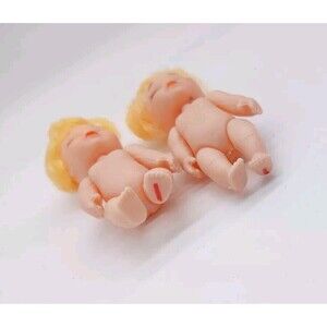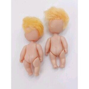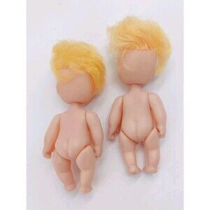 This vintage set includes two unmarked, unbranded nude dolls. One with curly yellow blonde hair and one with straight yellow blonde hair. Both have stunning blue eyes and beautiful eyelashes. The dolls are approximately 3.5 inches in size and are made of lightweight hollow plastic. They are perfect for collectors or for children to play with. They would make a great addition to any doll collection.