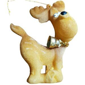 2 Vintage Flocked Moose Christmas Ornaments Reindeer Google Eyes Gold Bell 4.5"