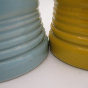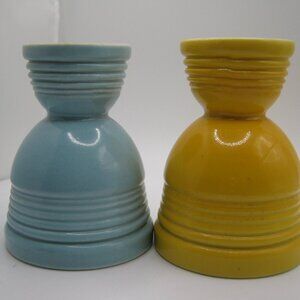Set of Vintage Hankscraff Fiesta Double Egg Cups - 1950's. These have been in my family my entire life. They are good vintage condition. Some straining on the inside where the porcelain is white but no chips. One cup is yellow the other is blue.