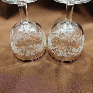 These Bartlett and Collins water goblets are made of thick crystal-clear glass with a raised-frosted design that features Grapes, Grape leaves, and Grape vines.