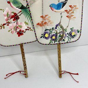 2 Vintage Japanese Bamboo Handle Hand Painted Bird Scene Silk Paper Paddle Fans