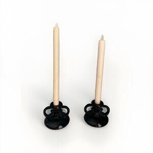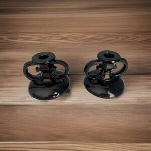 Add a touch of elegance to your home decor with these beautiful vintage L.E. Smith black amethyst glass taper candlestick holders. The rounded base and two loop handles make it easy to hold and display on any tabletop or mantelpiece. These holders are perfect for any room and occasion, whether it's a party, holiday, or just a cozy night in.