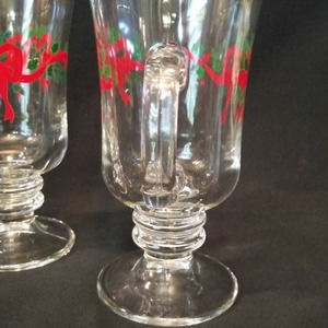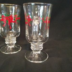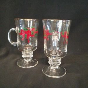 2 Vintage Libbey Clear Glass Pedestal Christmas Bow Irish Coffee Mugs Gold Trim