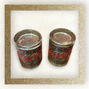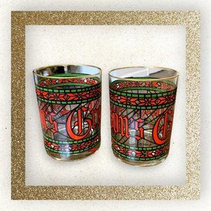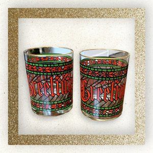 2 Vintage MCM HOUZE “Seasons Greetings” Stained Glass Gold Rimmed Glass