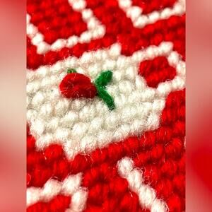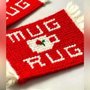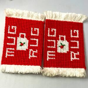 2 Vintage Mug Rug Coasters Hand Crafted of Red White Yarn Retro Grandma Coaster