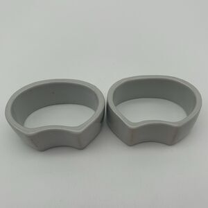 Add a touch of elegance to your dining experience with these vintage napkin rings. The green ginkgo leaf on a light gray ring creates a beautiful contrast that complements any table setting. Made of ceramic material, these napkin rings are durable and perfect for many occasions. The set includes two napkin rings, each with a height of 1.5 inches, a length of almost 2.5 inches and a width of almost 1 inch. Some wear due to age, no chips or cracks. Note some dark spots in the ceramic during the manufacturing process.