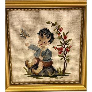 2 Vintage Needlepoint Boy Butterfly Girl Duck Gold Framed Wall Hangings 10"