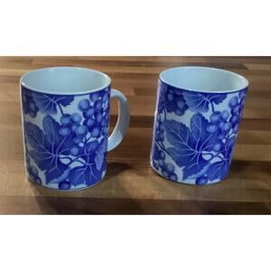 This product is a set of two vintage Omnibus by Fitz and Floyd Bordeaux mugs, each with a capacity of 12 ounces. The mugs feature a French Country style design with a graphic of grapevines, making them suitable for both hot and cold beverages. Made of ceramic and porcelain, these original coffee cups are collector's items from the 1990s and are perfect for any occasion. With a diameter of 3 1/8 rim diameter and a height of 3.75 inches, these blue and white mugs are a charming addition to any kitchen or home décor.