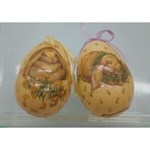 In this listing, you can find 2 vintage paper mache bunny Easter eggs from 1989 by Dakin Ornaments. The eggs feature far bunnies designs and are perfect for collectors of Easter and holiday ornaments. The country/region of manufacture is Taiwan.