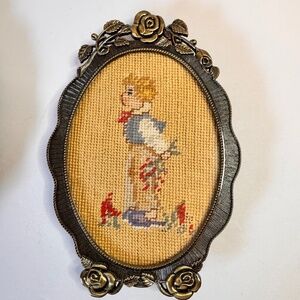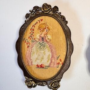 2 Vintage Rose Framed Needlepoint Boy & Girl Portraits
