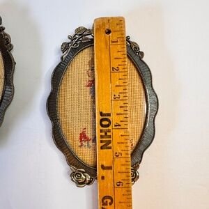 2 Vintage Rose Framed Needlepoint Hand Stitched boy with flowers in hand in one frame and girl in other frame looking at each other
