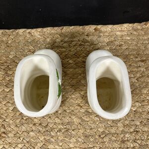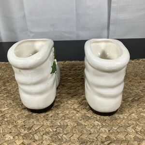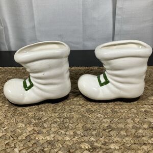 2 Vintage Santa Boot Ceramic White w/Holly Trim Green Buckle 5” Long X 4” Tall