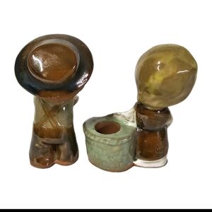 This product is a set of two vintage UCTCI Japan ceramic figurines of a little boy and girl candle holder. These small figurines stand at 3-8 inches tall and are decorated in a multicolor design. Made in Japan during the 1970s, they feature an art theme with a focus on people, particularly children. Perfect for collectors of decorative figurines or those looking to add a unique touch to their home decor.