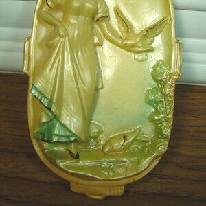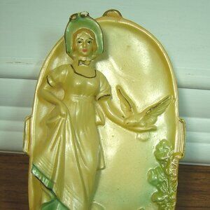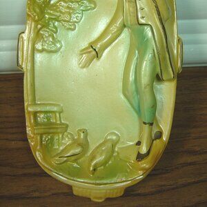 2 Vintage chalk ware plaques-man & lady with birds--7" x 4 1/4"