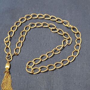 Vintage 1970s-1980s gold tone textured link chain belt. The length of the chain is 36". The tassel is 4". The belt has a hook closure that makes it adjustable is size. The hook is marked Japan.