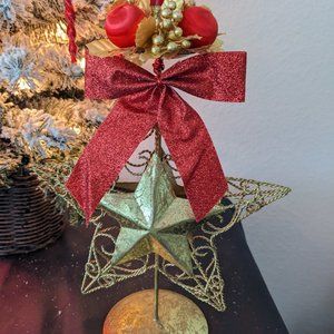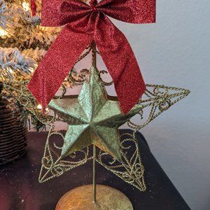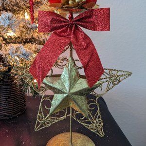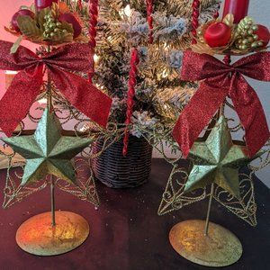 Pair of gold color start candle holders with candle rings, bows, and candle tapers.