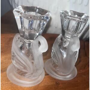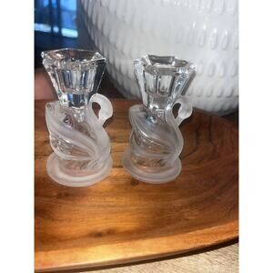 Add a touch of elegance to your home decor with this vintage Partylite candle holder set. The pair of crystal glass candle holders feature a beautiful swan design, perfect for any Hollywood Regency style enthusiast. Measuring at 4 inches in height, these candle holders are small and perfect for any occasion.