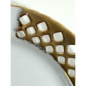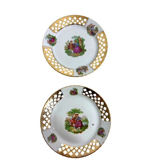 0694B- Vintage Set of 2 porcelain, ceramic round plates, stamped by APULUM, made in the 1970s Alba Iulia, Romania. Reticulated, courting couple design, romantic love, countryside background, pierced openwork border, gold, gilt trim adds an ornate touch, lattice, 6.5” diameter, glazed. Lovingly preowned, in good condition, one plate has a brown mark, back stamps are worn. See photos.