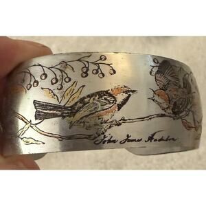 2 Vtg Reed and Barton Silver Damascene Birds Audubon & Heart Cuff Bracelets